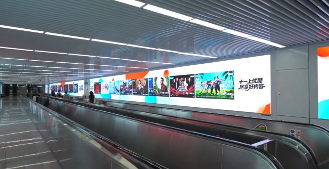 杭州地鐵創(chuàng)景路站A出入口通道墻面超長(zhǎng)LED大屏廣告形成一種包裹感和視覺(jué)上的連貫性。當(dāng)乘客穿行通道時(shí),廣告畫(huà)面可以伴隨其行進(jìn)軌跡,帶來(lái)更強(qiáng)的視覺(jué)沖擊和沉浸感。LED屏幕支持動(dòng)態(tài)視頻播放,相比靜態(tài)燈箱,色彩更鮮艷,表現(xiàn)力更強(qiáng)。這種形式非常適合展示品牌高端形象或進(jìn)行產(chǎn)品故事的生動(dòng)講述,其逼真的視覺(jué)效果能顯著提升廣告的關(guān)注度和記憶度。