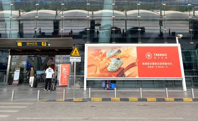 南寧機(jī)場(chǎng)T2航站樓三層國內(nèi)出發(fā)廳大門入口處站立式燈箱廣告位于航站樓玻璃墻與戶外行車道之間,正處于旅客從室外進(jìn)入室內(nèi)的空間轉(zhuǎn)換節(jié)點(diǎn)。旅客在此區(qū)域的視線會(huì)自然投向建筑入口,廣告內(nèi)容能夠直接進(jìn)入視野,形成旅客對(duì)機(jī)場(chǎng)商業(yè)環(huán)境的第一印象。單塊燈箱規(guī)格寬近8米,高度超過3米,總面積達(dá)25平方米以上。這種超寬的橫向構(gòu)圖與現(xiàn)代化航站樓的建筑尺度相協(xié)調(diào),在開闊明亮的入口環(huán)境中依然具備強(qiáng)烈的視覺存在感。