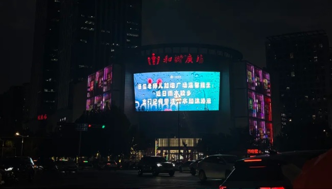 濟(jì)南和諧廣場(chǎng)外墻LED大屏廣告獨(dú)特的弧形設(shè)計(jì)在建筑立面上形成了獨(dú)特的視覺張力,不僅與建筑外觀更好融合,還能提供更寬廣的視角覆蓋,在復(fù)雜的城市環(huán)境中保持強(qiáng)烈的視覺存在感與沖擊力。大屏位于商場(chǎng)外墻玻璃幕墻上方高處醒目位置,視野開闊,無遮擋,使廣告信息能夠遠(yuǎn)距離清晰辨識(shí),實(shí)現(xiàn)了對(duì)主干道雙向車流及行人的廣域覆蓋。高頻次的播放策略能夠?qū)θ臻g不同時(shí)段經(jīng)過的龐大人流和車流進(jìn)行反復(fù)提示,有效利用乘客和駕駛者的碎片化等待時(shí)間,強(qiáng)化品牌認(rèn)知。